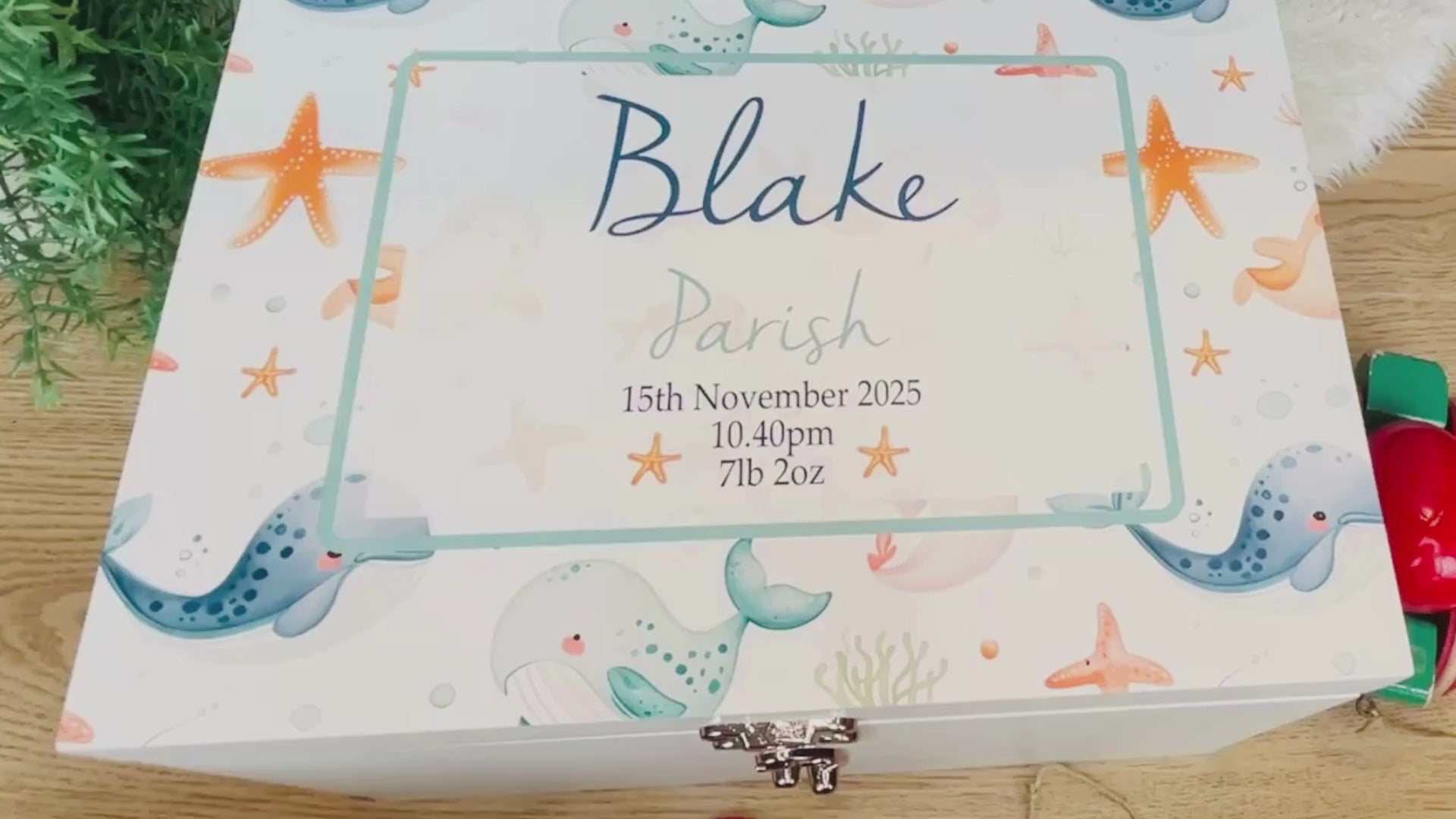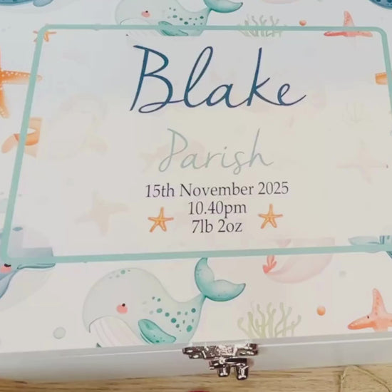 Cherish each special moment with this personalised heavy weight luxury white memory box with an adorable ocean life design, including whales and seashells. It makes an ideal custom gift for new babies, Christenings / baptisms, birthdays, Christmas, and the young at heart. Open the hinged lid to find ample space for keepsakes that create precious memories - tiny socks, rattles, treasured trinkets, toys, first locks of hair, and more. A thoughtful gift for the little sea lovers in your life.